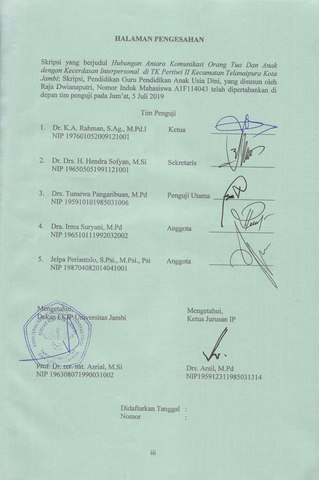 ABSTRAK Raja Dwianaputri. 2019. “Hubungan Antara Komunikasi Orang Tua Dan Anak dengan Kecerdasan Interpersonal Anak di TK Pertiwi II Kecamatan Telanaipura Kota Jambi”. Skripsi. Pendidikan Guru Pendidikan Anak Usia Dini. Jurusan Ilmu Pendidikan FKIP Universitas Jambi. Pembimbing I, Dr. K. A. Rahman, M.Pd.I. Pembimbing 2. Dr. Drs. H. Hendra Sofyan, M.Si. Kata Kunci: Komunikasi Orang Tua dan anak, Kecerdasan Interpersonal Anak Berdasarkan pengamatan di TK Pertiwi II Kecamatan Telanaipura Kota Jambi, peneliti banyak menemui kecerdasan interpersonal anak tidak berkembang secara optimal, terdapat anak yang tidak mau mengalah saat menggunakan permainan yang sama dengan temannya, ada anak yang tidak sabar ketika menunggu giliran atau ketika sedang antri pada saat mencuci tangan selain itu ada anak yang jarang bergaul dengan temannya maupun pada gurunya, saat anak berbicara orang tua kurang memperhatikan anaknya. Tujuan penelitian ini yaitu untuk mengetahui hubungan komunikasi orang tua dan anak dengan kecerdasan interpersonal anak di TK Pertiwi II Kecamatan Telanaipura Kota Jambi Jenis penelitian ini yang digunakan dalam penelitian ini adalah penelitian kuantitatif korelasional, untuk mengetahui ada tidaknya hubungan variabel yang satu dengan variabel yang lain, berdasarkan koefisien korelasi. Berdasarkan populasi yang ada yaitu 63 anak maka sampel di ambil secara keseluruhan secara total sampel. Berdasarkan hasil analisis data diperoleh Untuk uji normalitas Lo < Ltabel, maka data dari kedua variabel memiliki distribusi data yang normal karena, untuk data angket komunikasi orangtua dan anak Lo (0.0991) < Ltabel (0,1116), sedangkan data kecerdasan interpersonal didapat Lo (0,1039) < Ltabel (0,1116). Berdasarkan hasil pengolahan korelasi, maka nilai r = 0.94433713 memiliki arti bahwa hubungan antara komunikasi orangtua dan anak dengan kecerdasan interpersonal di TK Pertiwi II Kecamatan Telanaipura Kota Jambi termasuk dalam kategori tinggi. Dengan menggunakan rumus (n-2) 63-2 = 61 pada α = 0,05, maka dengan dk 61, untuk uji dua pihak t 0,95 = 1,6702 mudah dilihat bahwa t_(hitung=) 22.41937 > t_tabel 1,6702 maka terdapat hubungan antara komunikasi orangtua dan anak dengan kecerdasan interpersonal di TK Pertiwi II Kecamatan Telanaipura Kota Jambi. Dapat disimpulkan bahwa terdapat hubungan antara komunikasi orangtua dan anak dengan kecerdasan interpersonal di TK Pertiwi II Kecamatan Telanaipura Kota Jambi.dengan hasil uji hipotesis yang signifikan.