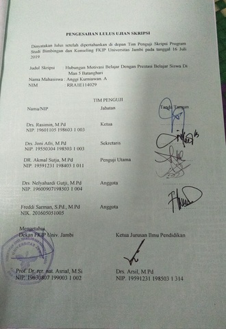 ABSTRAK Judul Skripsi : Hubungan Motivasi Belajar dengan Prestasi Belajar pada Siswa MAN 5 Batanghari Tahun 2018 Nama : Anggi Kurniawan. A NIM : RRA1E114029 Dosen Pembimbing : 1. Drs. H. Rasimin, M.Pd 2. Drs. Joni Afri, M.Pd Mengingat realisasi tujuan pendidikan secara menyeluruh pembulatan perkembangan peserta didik dan kenyataan bahwa adanya setumpuk perbedaan individu yang semuanya tercakup dalam lingkup tujuan pendidikan secara nasional, maka harus dikatakan bahwa pendidikan sekolah dewasa ini tidak akan lengkap tanpa layanan bimbingan sebagai bagian integral dari keseluruhan program kegiatan pendidikan di sekolah. Fenomena di lapangan MAN 5 Batanghari menurut kepala sekolah bawha dorongan belajar adalah membantu individu untuk mengembangkan diri secara optimal sesuai dengan tahap perkembangan dan predisposisi (kecendrungan) yang dimilikinya, berbagai latar belakang yang ada (latar belakang keluarga, pendidikan, status sosial ekonomi), serta sesuai dengan tuntutan positif lingkungannya. Hubungan Motivasi Belajar dengan Prestasi Belajar pada Siswa MAN 5 Batanghari Tahun 2018, yang berkaitan dengan (1) Motivasi belajar yaitu pilihan dalam belajar, keyakianan untuk sukses dan keuletan dalam berusaha, dan (2) Prestasi Belajar yaitu perubahan tingkah laku pada diri seseorang yang menyangkut pengetahuan, sikap, dan keterampilan. Penelitian ini dilakukan pengujian hipotesis dilakukan dengan uji statistik, yaitu regresi linier di MAN 5 Batanghari dengan populasi dan sampel 57 orang siswa diambil secara teknik total sampling. Hasil pengolahan data tentang motivasi belajar (X) dan prestasi belajar (Y) sebesar 0,843 lebih besar dari 0,05 atau (0,843 > 0,05) sehingga dapat disimpulkan bahwa motivasi belajar (X) dan prestasi belajar (Y) di MAN 5 Batanghari, yang di uji berdistribusi normal. Hubungan motivasi belajar dengan prestasi belajar ternyata perhitungan melalui korelasi untuk rxy = 0,843 ini korelasi tergolong korelasi tinggi, hubungan besar, dan untuk menguji signifikasinya, maka dapat disimpulkan bahwa terdapat hubungan yang positif dan berarti antara motivasi belajar dan prestasi belajar. Maksudnya motivasi belajar dan prestasi belajar memiliki kontribusi atau hubungan pada pencapaian siswa dalam pengertian yang lain semakin baik motivasi belajar maka akan semakin baik pula prestasi belajar siswa. Bila hasil penelitian ini diimplikasikan pada kegiatan bimbingan dan konseling maka dalam proses konseling berupaya membantu siswa untuk dapat memperoleh prestasi belajar siswa yang optimal dan menumbuhkan pandangannya serta anggapannya mengenai belajar secara positif yang pada gilirannya akan menimbulkan prestasi belajar siswa. Motivasi belajar dengan prestasi belajar yang baik ini tentunya akan memberikan kepuasan pada diri siswa, guru dan sekolah yang pada akhirnya akan mengangkat nama baik pendidikan di Indonesia dan meningkatkan sumber daya manusia Indonesia.
