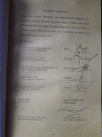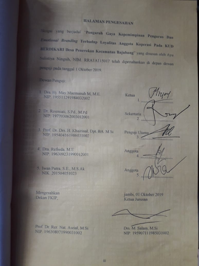 ABSTRAK Ningsih,Ayu Sulistiya, 2019. Pengaruh gaya kepemimpinan pengurus dan emotional branding terhadap loyalitas anggota koperasi pada KUD BERDIKARI Desa Penerokan Kecamatan Bajubang. Skripsi. Jurusan Pendidikan Ekonomi dan Ilmu Pengetahuan Sosial. FKIP Universitas Jambi, Pembimbing (I) Dra.May Maemunah M, M.E (II) Dr. Rosmiati, S.Pd., M.Pd Kata Kunci :Gaya Kepemimpinan Pengurus, Emotional Branding, Loyalitas Anggota. Loyalitas anggota koperasi yang ada di KUD BERDIKARI Desa Penerokan saat ini masih rendah. Gaya kepemimpinan pengurus yang dirasa kurang sesuai dan emotional branding yang rendah dari anggota menyebabkan loyalitas anggota masih rendah. Penelitian ini bertujuan untuk mengetahui pengaruh gaya kepemimpinan pengurus dan emotional branding terhadap loyalitas anggota koperasi pada KUD BERDIKARI Desa Penerokan Kecamatan Bajubang. Jenis penelitian ini merupakan penelitian dengan metode kuantitatif. populasi dalam penelitian ini adalah anggota koperasi yang berjumlah 160 orang anggota. Metode pengumpulan data menggunakan angket. Hasil penelitian ini mengggunakan analisis regresi hasil koefisien determinasi terlihat bahwa nilai R Square sebesar 0,620. Hal ini berarti bahwa variabel bebas memberikan sumbangan kepada variabel terikat sebesar 62% dan sisanya sebesar 38,0% dipengaruhi oleh fakor lain. Selain itu, nilai signifikansinya 0,000<0,05. Sehingga Ha diterima dan Ho ditolak. Hal ini berarti bahwa gaya kepemimpinan pengurus (X_1) dan emotional branding (X_2) secara bersama-sama berpengaruh terhadap loyalitas anggota (Y). Berdasarkan hasil penelitian ini dapat disimpulkan terbentuk 2 variabel yaitu terdapat pengaruh gaya kepemimpinan pengurus dan emotional branding terhadap loyalitas anggota koperasi pada KUD BERDIKARI Desa Penerokan Kecamatan Bajubang. Persamaan regresi diperoleh dengan perhitungan yaitu Y = 13,314 + 0,497 X1 + 0,428 X_2. Maknanya menunjukkan bahwa jika gaya kepemimpinan pengurus baik dan emotional branding tinggi, maka akan mengakibatkan loyalitas anggotanya juga akan semakin tinggi. Berdasarkan hasil penelitian yang telah dilakukan disarankan pengurus koperasi beserta pimpinan hendaknya mampu menerapkan gaya kepemimpinan yang sesuai dan dibutuhkan oleh para anggotanya dan juga memperbaiki emotional branding dalam koperasi. Hal ini dimaksudkan agar para anggota merasa nyaman sehingga akan timbul loyalitas dari para anggota.