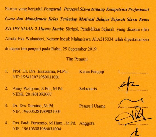 PENGARUH PERSEPSI SISWA TENTANG KOMPETENSI PROFESIONAL GURU DAN MANAJEMEN KELAS TERHADAP MOTIVASI BELAJAR SEJARAH SISWA KELAS XII IPS SMAN 2 MUARO JAMBI