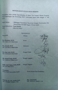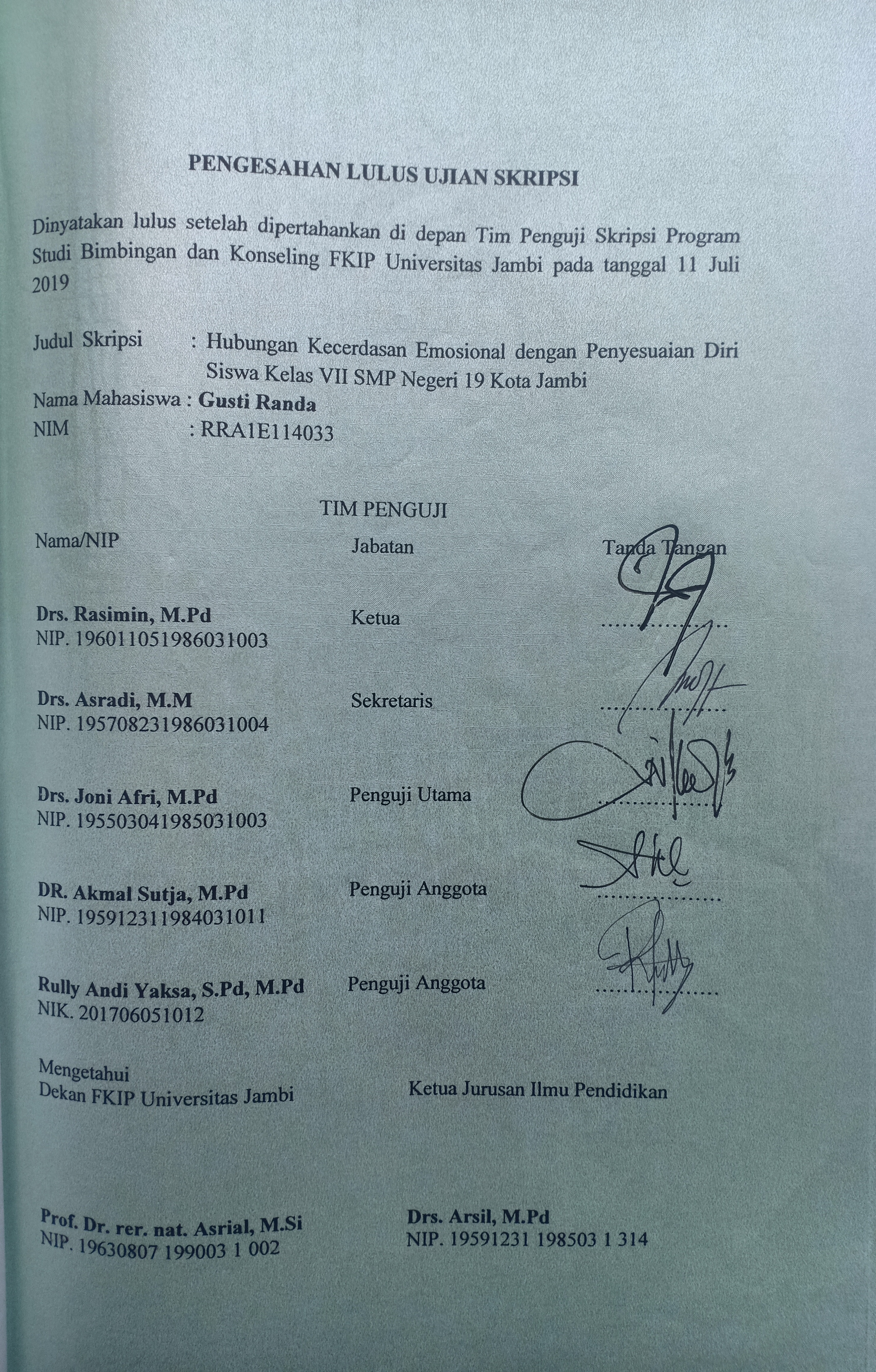 RANDA, GUSTI (2019) HUBUNGAN KECERDASAN EMOSIONAL DENGAN PENYESUAIAN DIRI SISWA KELAS VII SMP NEGERI 19 KOTA JAMBI. JURNAL HUBUNGAN KECERDASAN EMOSIONAL DENGAN PENYESUAIAN DIRI SISWA KELAS VII SMP NEGERI 19 KOTA JAMBI.